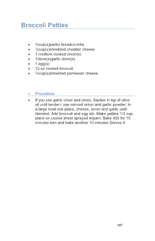 blended. Add broccoli and egg stir. Make patties 1/3 cup.
